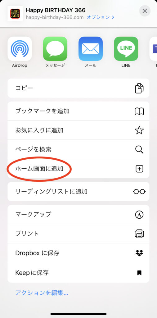 3. 「ホーム画面に追加」を押下する。